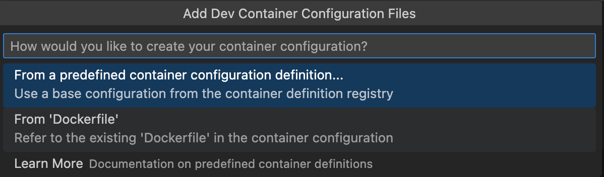 You will be asked to choose Container Configuration Files. Select the second option: From 'Dockerfile'