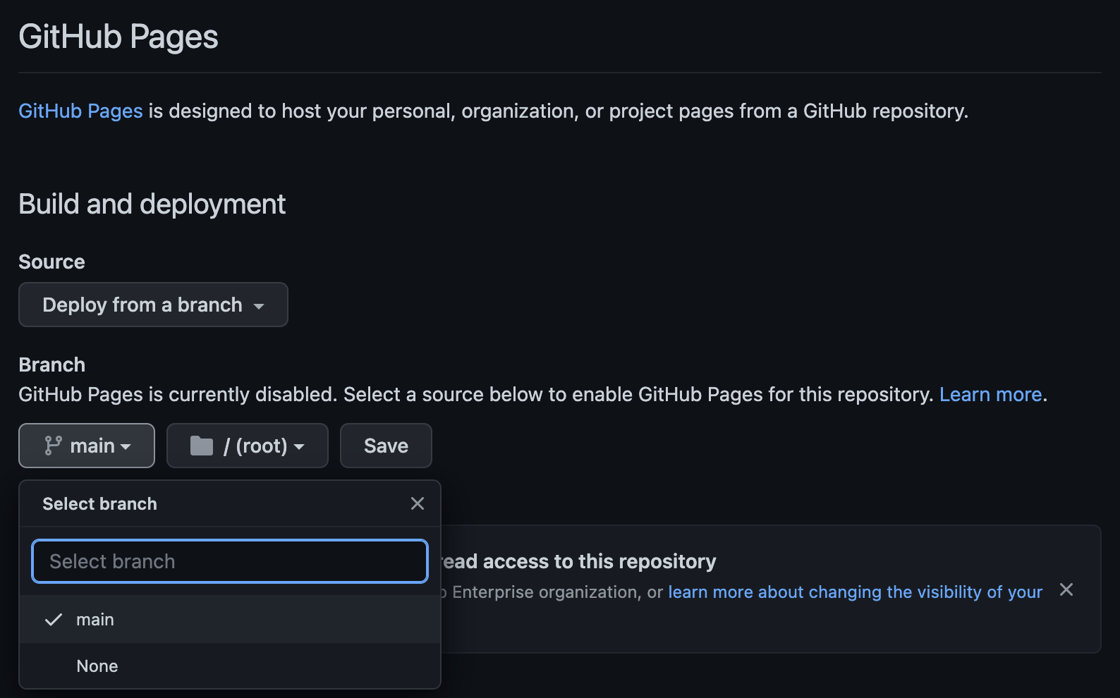 tab. Choose the main branch as the source and click on Save