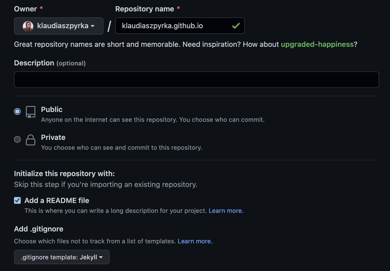 I recommend initializing the repository with a README file and a .gitignore file from the Jekyll template.