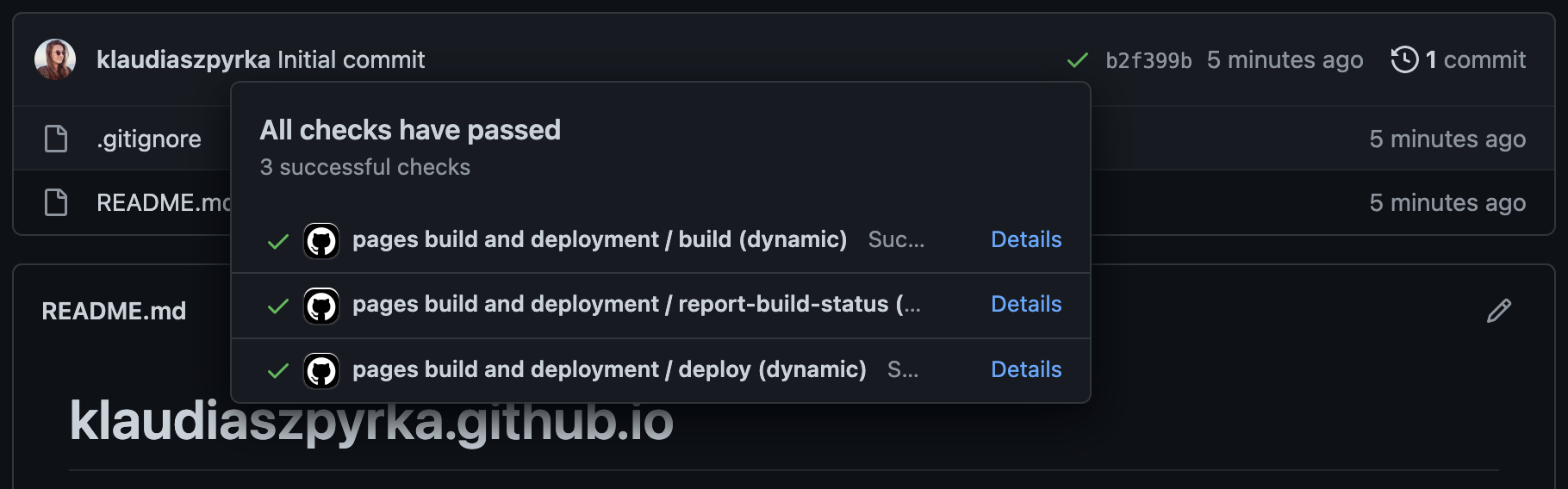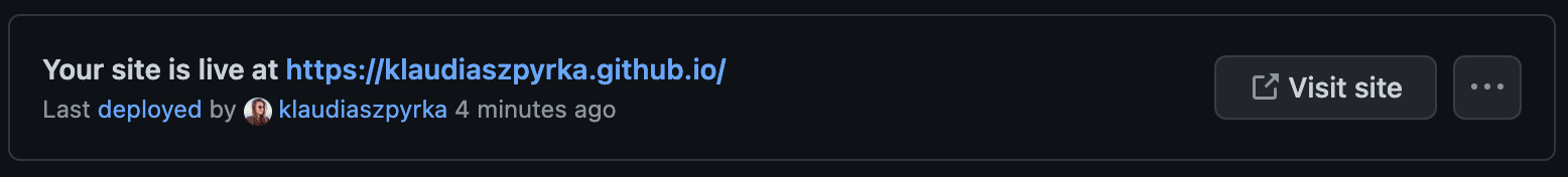 After a couple of minutes the website should be ready. You can check in the Pages tab for a Your site is live at… infobox or on the main page of your repository – look for a green checkmark on the commits tab.